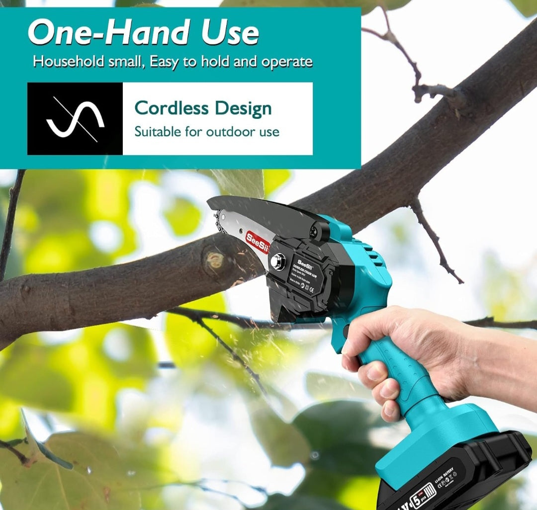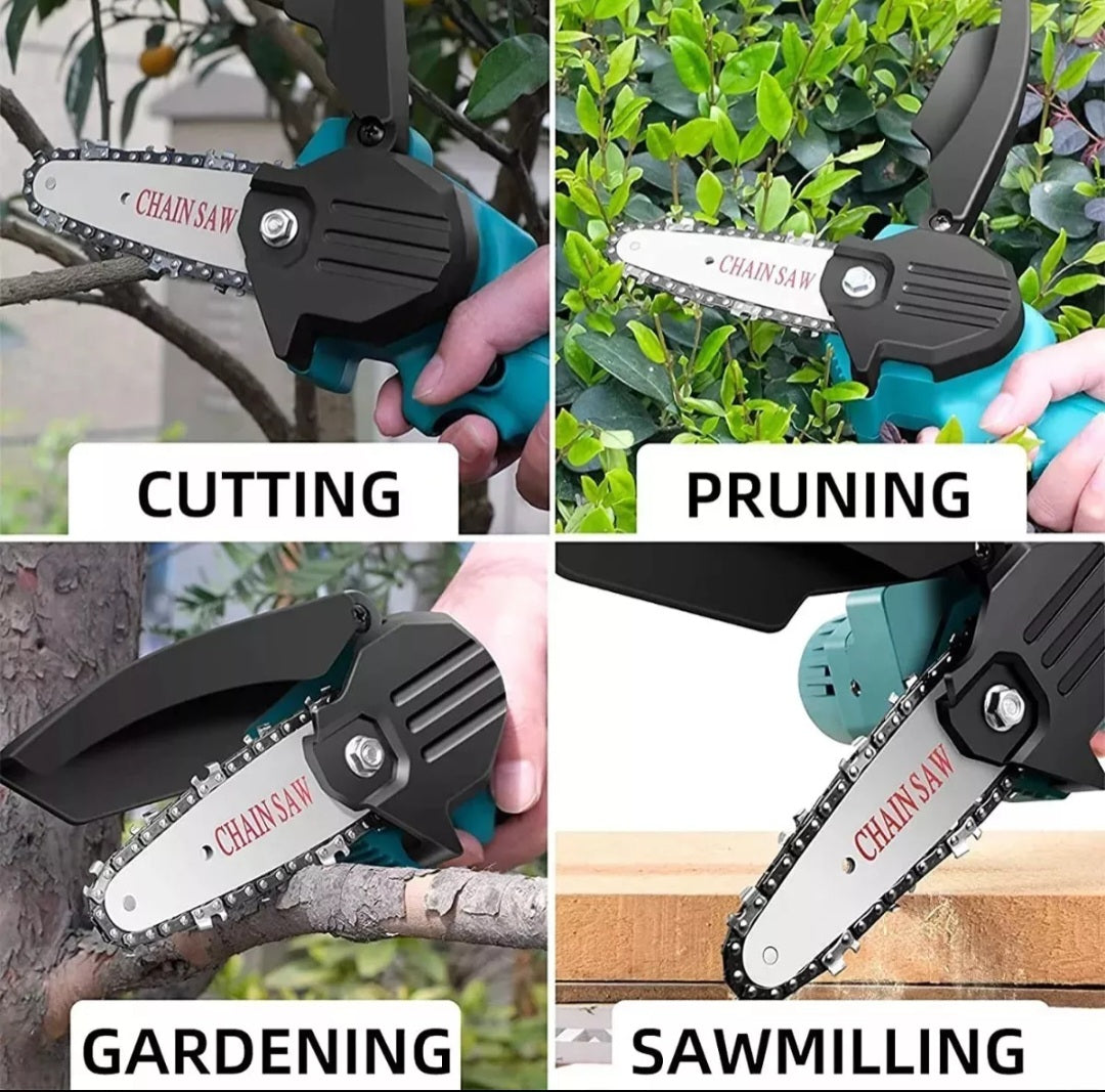 - ? La mini motosierra proporciona cadenas, adopta una cadena guía de alta calidad que ha sido sometida a un proceso de enfriamiento profundo para garantizar un corte más suave y más resistencia al desgaste.