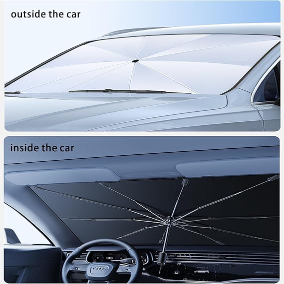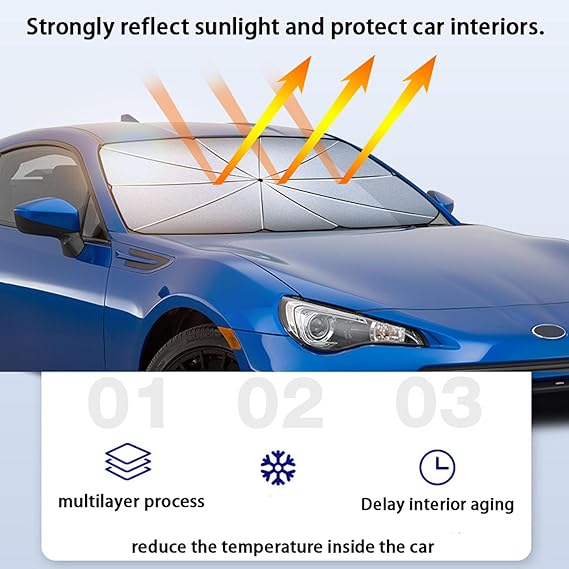 - la pantalla del parabrisas está hecha de pegamento de plata de titanio de alta calidad y tela de impacto para lograr el máximo aislamiento UV. Hay 10 huesos de paraguas para garantizar el mejor soporte, diseño de apertura. Su material de tela tiene una excelente protección solar y un efecto de absorción de calor. La temperatura interior del automóvil puede descender entre 30 y 40 grados centígrados.