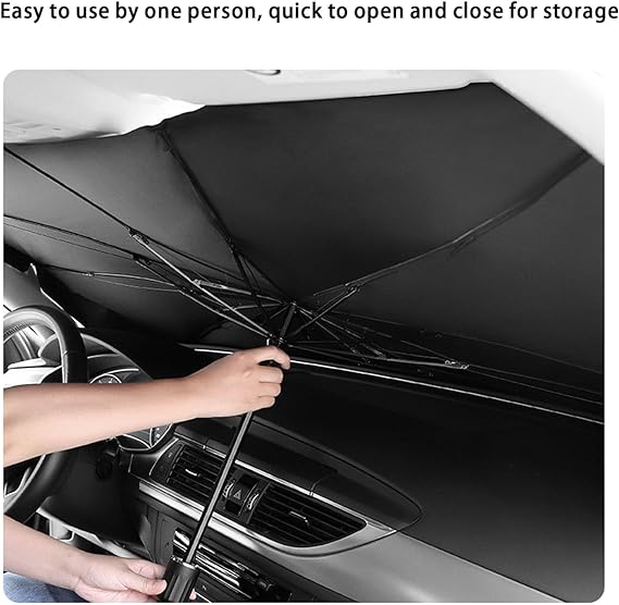 - ???Fácil de usar y almacenar?--Al igual que un paraguas, nuestro parasol es fácil de instalar y plegar, lo que se puede hacer en segundos. Puede guardarlo en la guantera, el panel de la puerta o debajo del asiento sin ocupar espacio adicional.