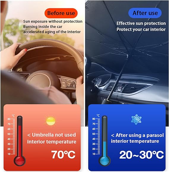 - ??? Proteja el interior del automóvil?: las sombrillas del parabrisas del automóvil pueden evitar eficazmente que el automóvil se sobrecaliente. Mantenga de manera efectiva la temperatura interior de su automóvil para que su vehículo se mantenga fresco. Puede aislar el calor intenso y los rayos UV, y evitar que el interior se decolore y agriete debido a la exposición al sol.